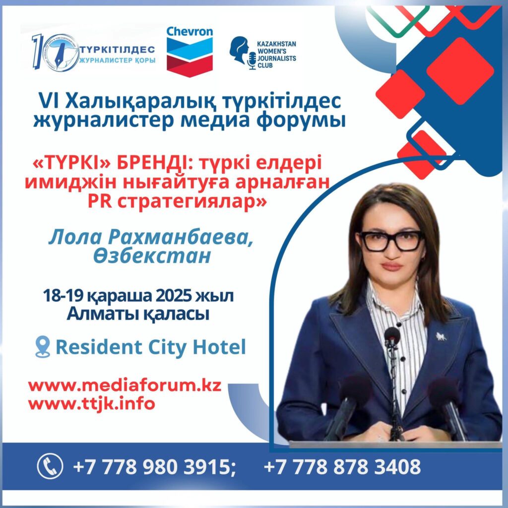 2025 жылдың 18-19 қарашасында Алматыда ұйымдастырылатын VI Халықаралық түркітілдес журналистер медиа форумында «ТҮРКІ» БРЕНДІ: түркі елдерінің имиджін нығайтуға арналған PR стратегиялар». тақырыбына баяндама жасайтын Өзбекстан Туризм министрінің кеңесшісі Лола Рахманбаева тарихи және мәдени мұралар арқылы түркінің ортақ құндылықтарын насихаттаудың жолдары жайлы айтады.
